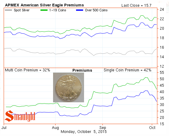 American Silver Eagle retail premiums have fallen to 42% as of October 5, 2015