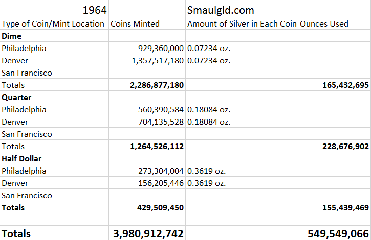chart showing number of ounces of silver used in 1964 to produce dimes quarters and half dollars at the US mint in 1964