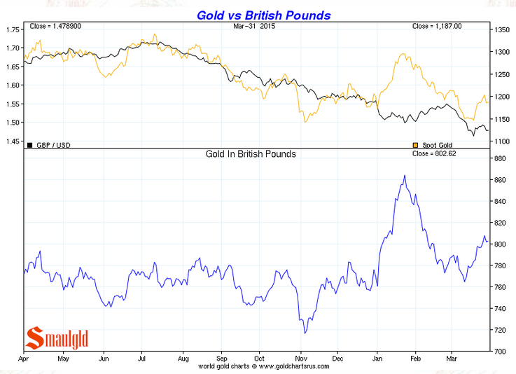 Gold rose 4.9% against the British Pound in the first quarter of 2015.
