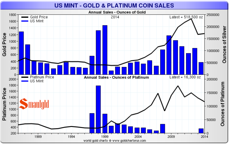 Platinum and Gold Eagle Sales at the US Mint 1986-2014