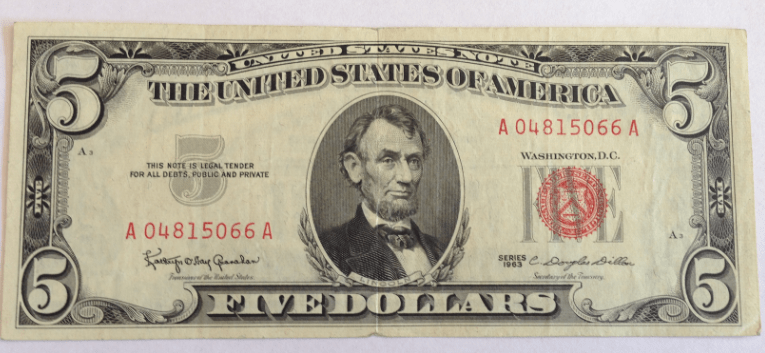 United States Notes are considered legal tender and can be redeemed for Federal Reserve Notes. Like the Silver Certificates, United States Notes are collectibles and you can buy a $5 one for less than $15.