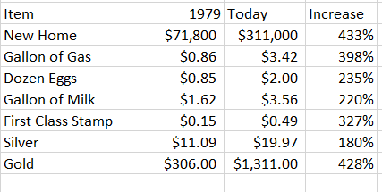 Chart showing the prices of gold silver real estate and food items in 1979 vs. 2014