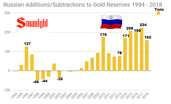 Central Bank of Russia Gold Reserves additions and subtractions 1994 August 2018