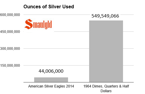 ounces of silver used smaulgld 2014 vs 1964
